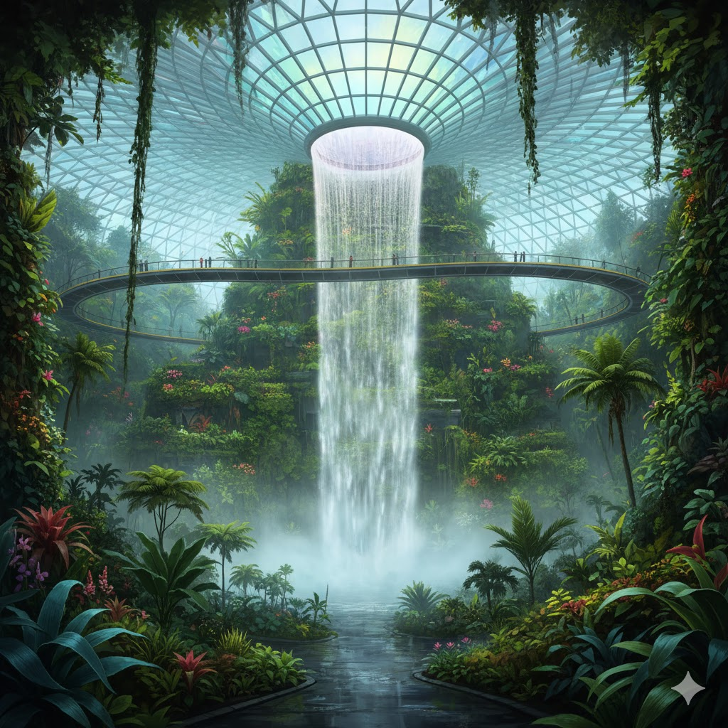 Cloud Forest menghadirkan suasana hutan pegunungan tropis dengan air terjun indoor tertinggi di dunia setinggi 35 meter.
